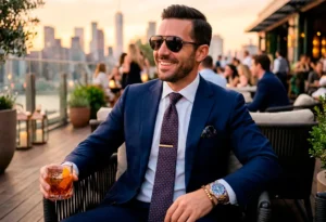 | Business Casual | Navy Blazer + Chinos | Leather strap watch + Signet ring |